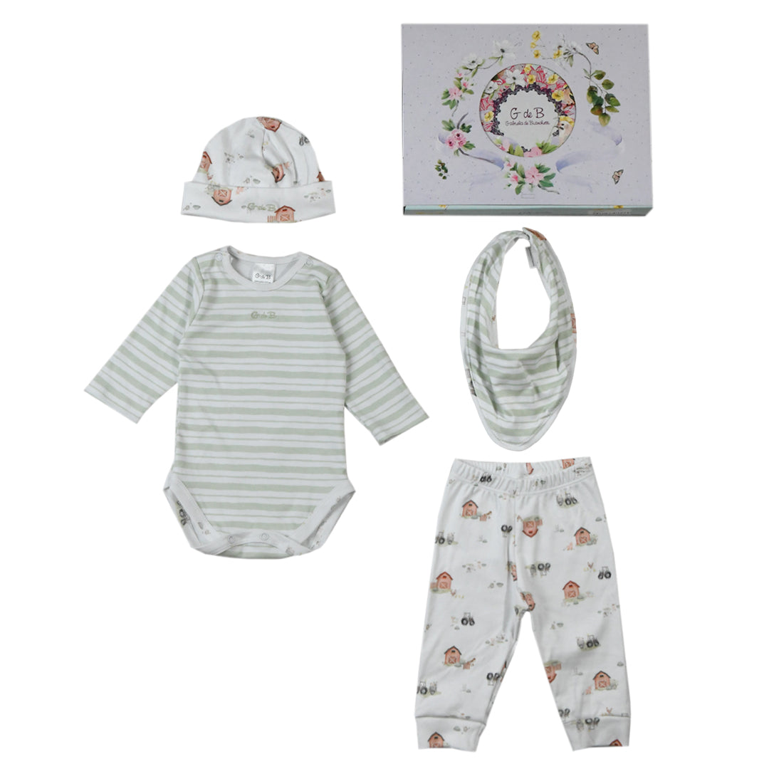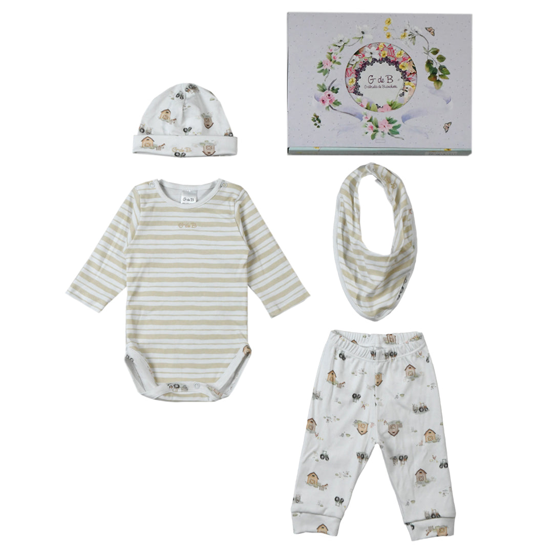 Ajuar de interlock estampado. Body, pantaloncito, gorro y babero en cajita.