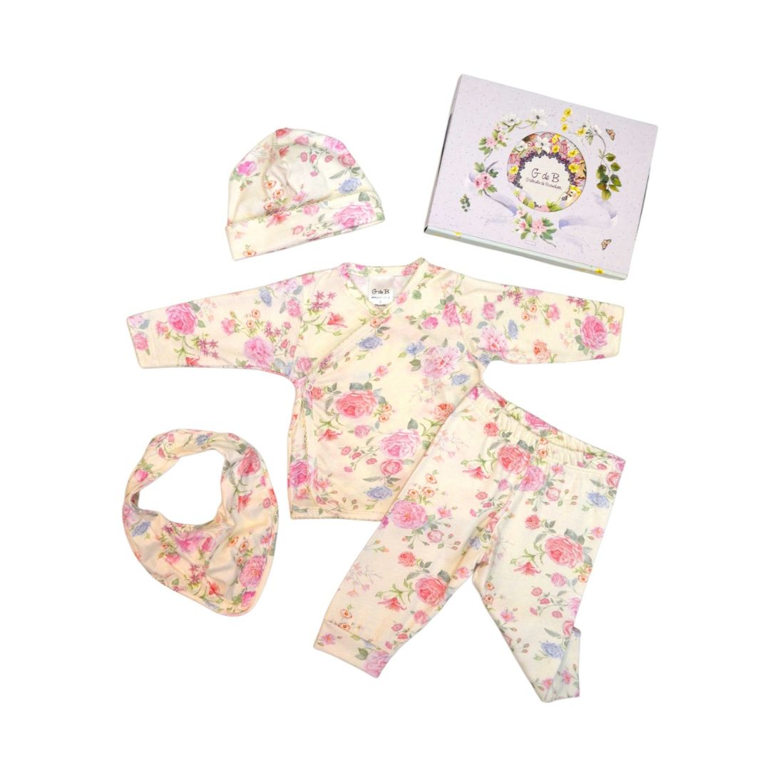 Ajuar de jersey estampado con batita, 4 piezas en cajita